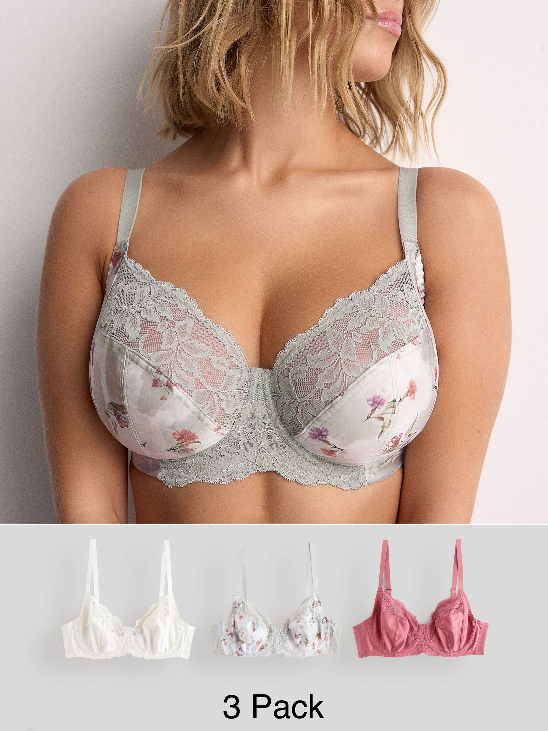 Pink/Cream/Green Floral DD+ Non Pad Full Cup Bras 3 Pack